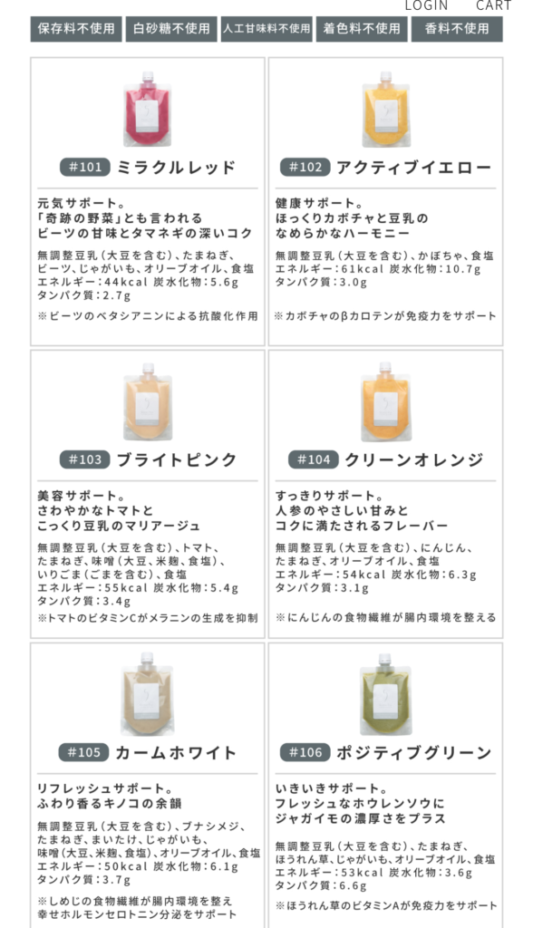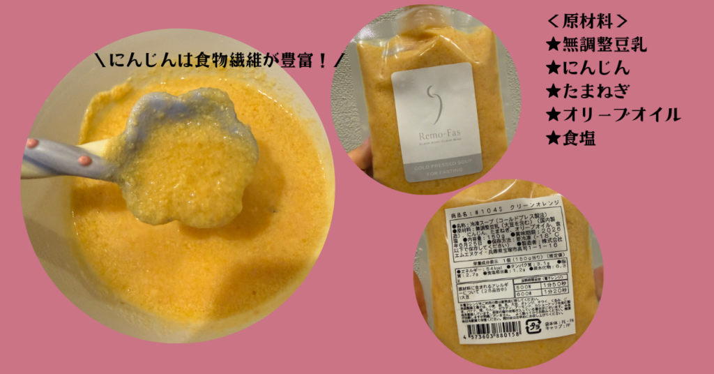 クリーンオレンジは、無調整豆乳ベースでにんじんたまねぎに加え、オリーブオイル食塩でシンプルに仕上げられています。