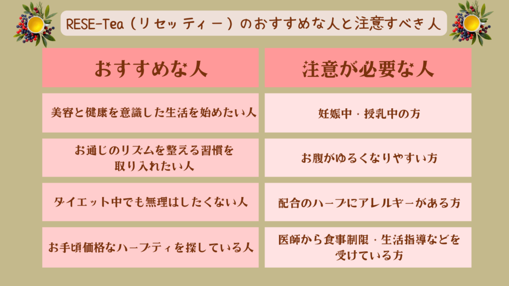 RESE-Tea(リセッティー)がおすすめな人と、注意が必要な人は以下のとおりです。